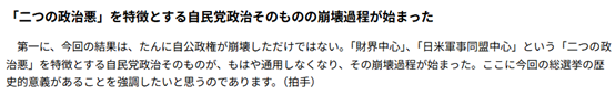 でもその「共闘」も、―――「独立」ではなく反対に、対米従属・軍国主義・戦争態勢「日米軍事同盟」整備の立憲民主党との「共闘」であり、議会制民主主義破壊の「小選挙区制」選挙区候補者調整を要求する二大政党制政治を求める「市民」運動との「共闘」であり、―――現『党綱領』「変革」路線ではない。よく言って「よりまし政権」暫定「共闘」でしかありません。でもそれは『自民党政治』の枠内での政治です。