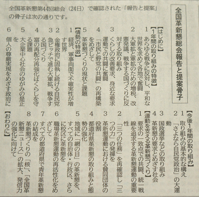ところが、志位和夫による「新しい政治プログラムが始まった」「新しい政治を探求する時代の本格的到来」論は、自分で決めた「変革」路線にさえ基づいていません。党大会はそのような代物を情勢論の基調に置いている。まともな政党ではありません。