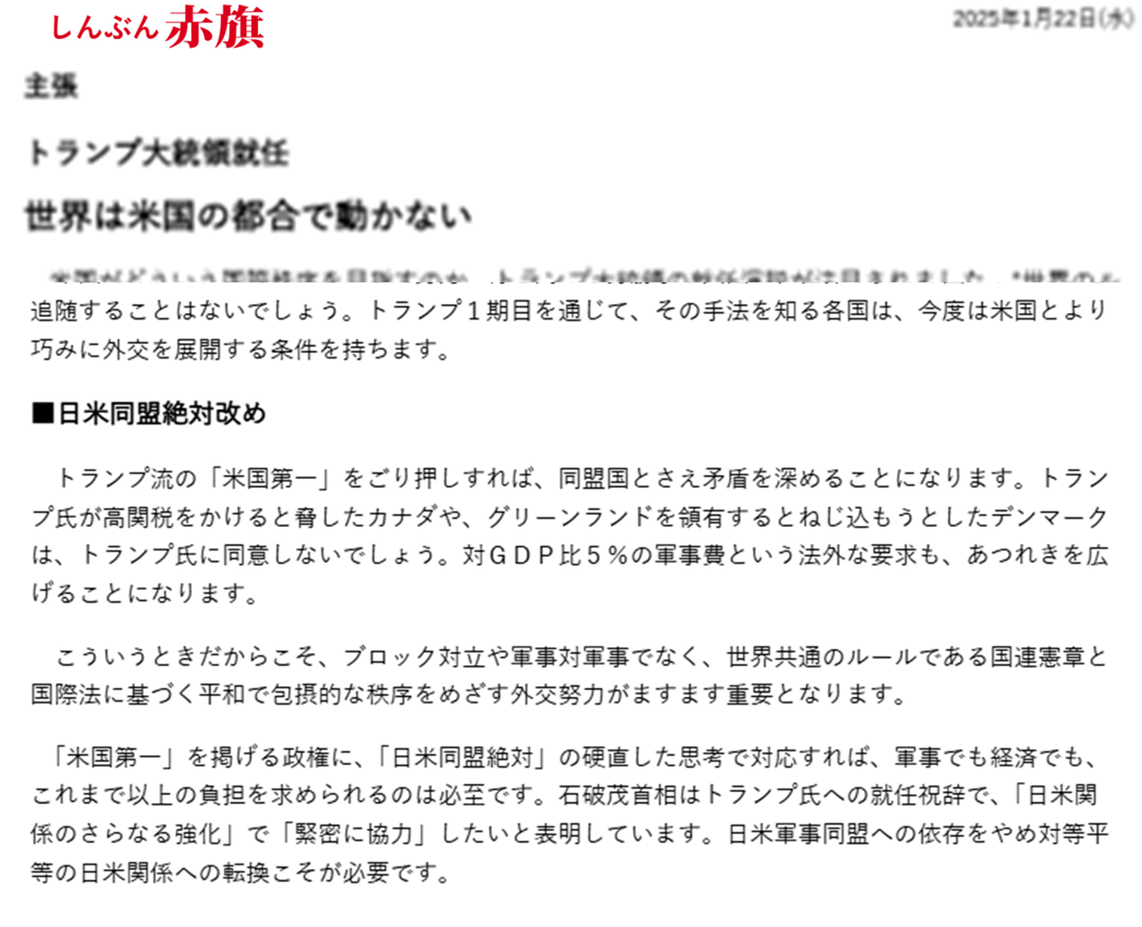 また、「アメリカいいなりの『戦争国家』づくり」という政策は、「戦争国家」(軍国主義)づくりが日本独占資本の本性(新たな「大東亜」覇権)から自ら行っている行為であるという問題を脇に置く日本独占資本主義美化論になっている。加えて、日本独占資本がすすんでアメリカ独占資本に従う路線をとっている売国性にある問題も見ようとしない二重の欺瞞的政策です。